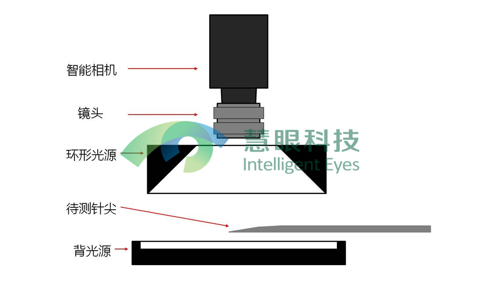 此视觉检测机构主要由智能相机、镜头、光源组成。本系统中,主要的任务是获取清晰的针尖轮廓,以便于跟设定值相比较。在背光照明方式下,光源均匀地从被检测物体的背面照射,可以获取高清晰的针尖轮廓;而在环形光照明方式下,能产生适合高反射物体的无方向、柔和的光。依据被测物体的实际情况且为了防止光源之间的干扰,设计了一套同时结合背光照明和环形光红照明这两种光源的照明子系统。